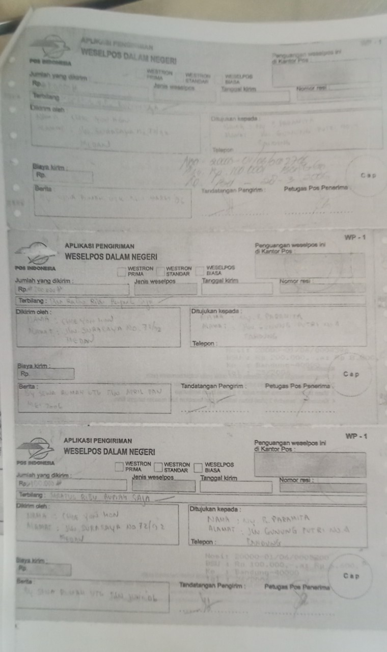 “Pembayaran kemudian dilanjutkan melalui wesel pos kepada Paramita di Surabaya. Dan ini ada bukti kwitansi pembayaran serta wesel pos,” ungkapnya menunjukan bukti transfer wesel pos.
