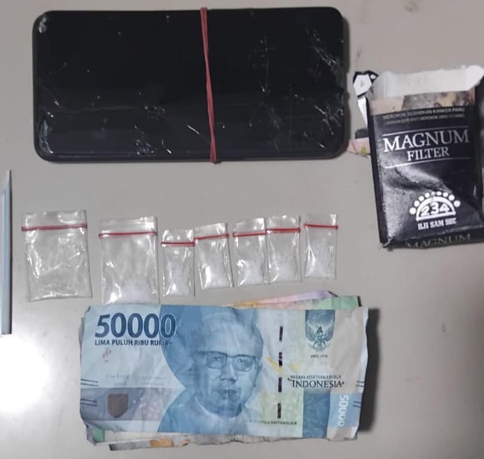 Barang bukti yang berhasil diamankan antara lain satu plastik klip sedang berisi 5 palstik klip kecil shabu, satu plastik klip kosong, satu pipet ujung runcing, satu kotak rokok Magnum, satu unit handphone, satu buah dompet, serta uang tunai sebesar Rp. 80.000,-.