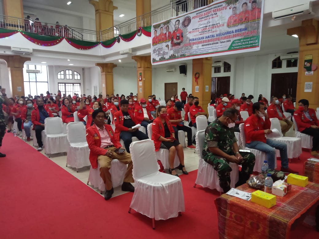 METRO,MEDAN | Dewan Pimpinan Daerah Pemuda Batak Bersatu (PBB) Sumatera Uatara mengelar acara Perayaan Natal & Tahun Baru 2022 di Gedung Alfa Omega di Jalan Diponogoro Medan, Sabtu (8/1/2022).